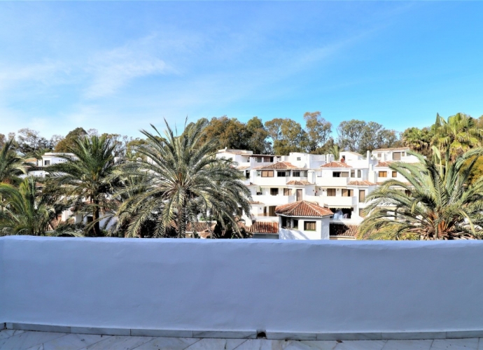 Spacious and bright duplex penthouse in Elviria located in an urbanization with direct access to the beach, with beautiful and lush tropical gardens and two community pools. 24 hour security. The property is distributed as follows: - on the ground floor: hall, living room, large terrace of 26 m2 overlooking the garden, sea and mountains, fully equipped kitchen with laundry terrace, 2 bedrooms and 1 bathroom with direct access from both bedrooms. The terrace is accessed both from the living room and from one of the bedrooms. - upstairs: spacious master bedroom with dressing room and 1completely exterior bathroom with whirlpool bath and shower. Through a spiral staircase you access another attic room that was previously a terrace. Small storage room inside the house. Community outdoor parking. It is sold semi-furnished. Other features of the house include: electric shutters, marble floors, air conditioning, 2 pellet fireplaces and fitted wardrobes. Big profitability for short and long-term rentals. We make the process of selling, buying or renting your home a success. We find your Ideal House thinking about your needs.